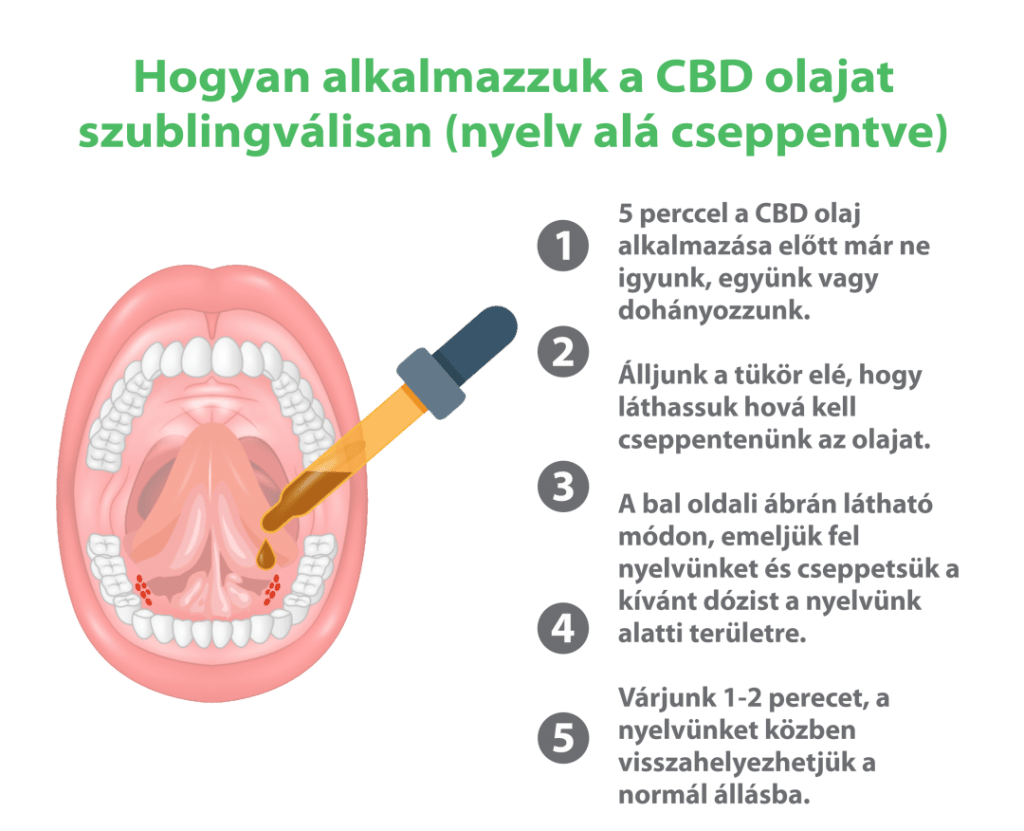 A CBD-t mindig tiszta szájba a nyelv alá cseppentsük (kb. 10 perccel előtte ne étkezzünk és öblítsük ki a szájüreget tiszta vízzel.) Tartsuk a nyelv alatt 15-20 másodpercig, majd nyeljük le. Utána kb. 30 percig ne fogyasszunk folyadékot és ételt se, hogy a száj nyálkahártyában lévő mennyiség minél tovább tudjon felszívódni.